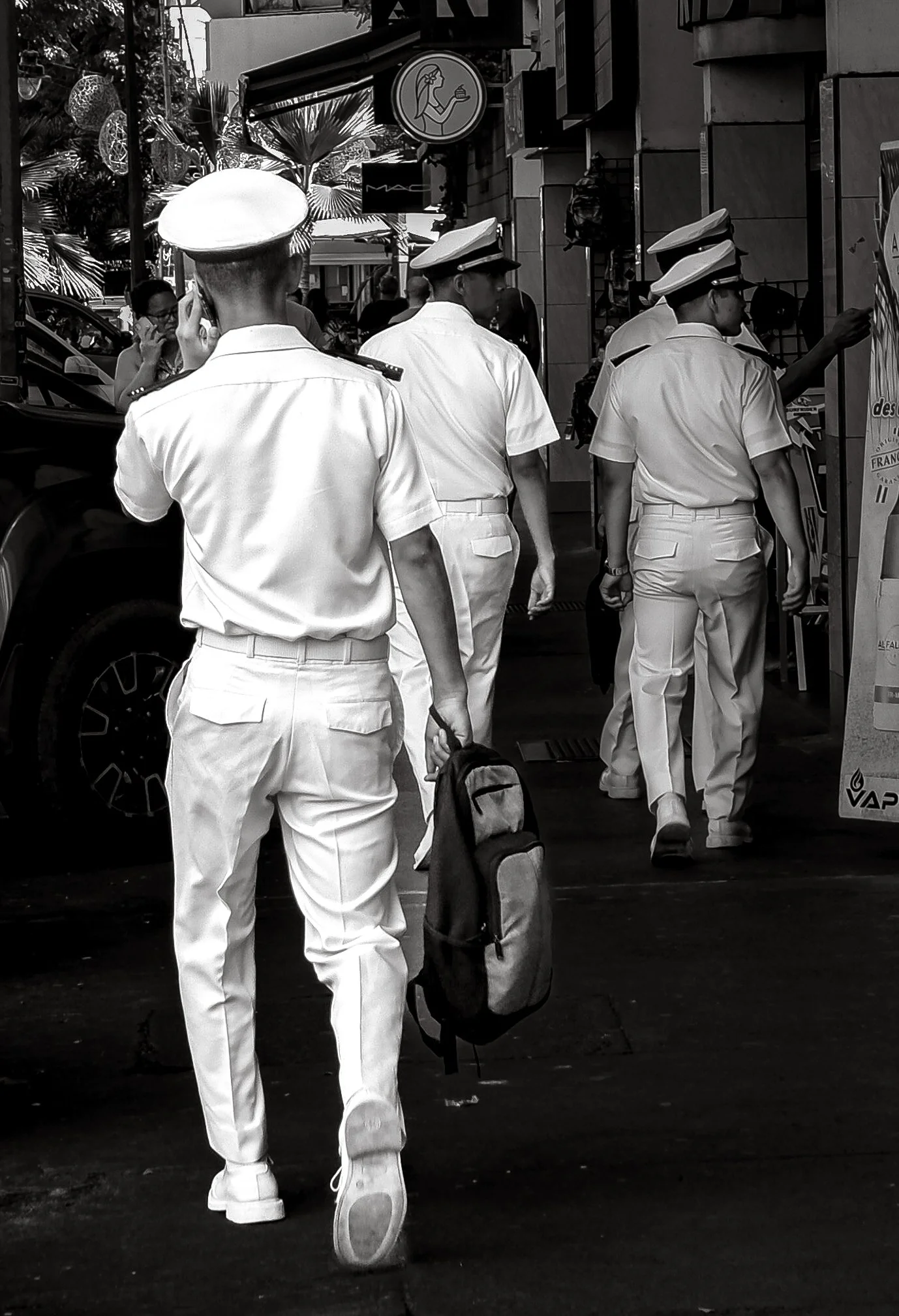 En juillet 2023, un immense voilier péruvien a fait escale quelques jours à Tahiti. Un groupe de marins, probablement en pause-bateau, se promenait au centre-ville de Papeete.